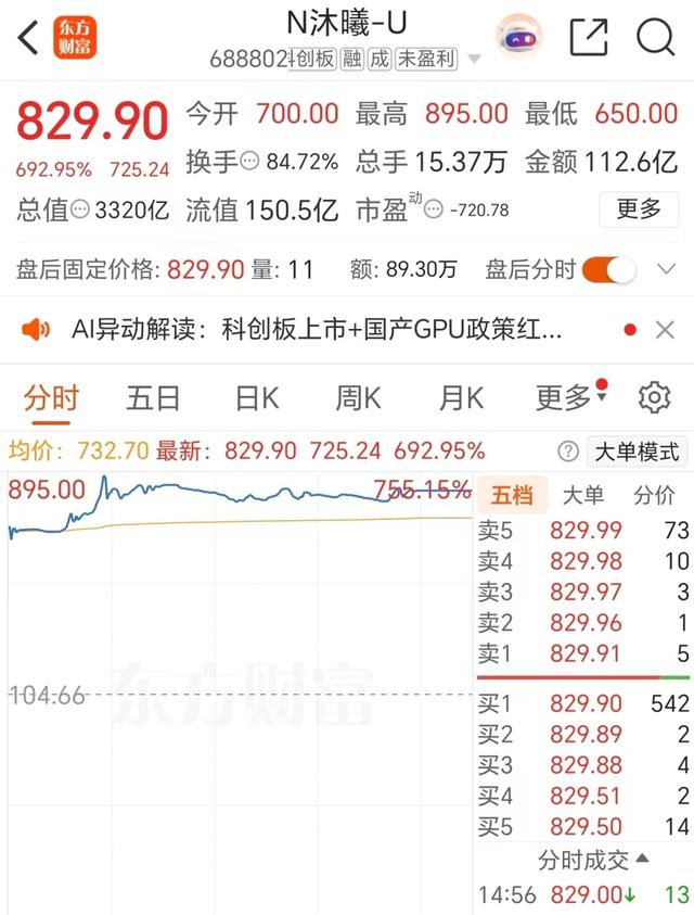 截至收盘,沐曦股份+692.95%,一天7倍,比前些天上市的摩尔线程还牛。