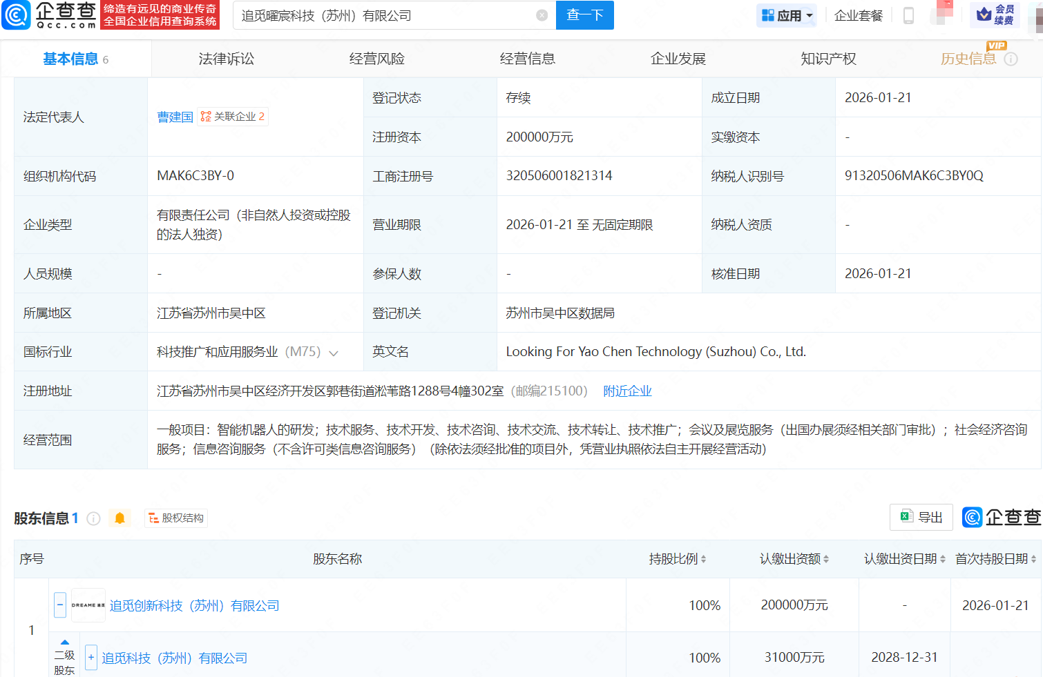 企查查APP显示,近日,追觅驰宸科技(苏州)有限公司、追觅曜宸科技(苏州)有限公司成立,法定代表人均为曹建国,注册资本均为20亿元,经营范围均为智能机器人的研发,技术服务、技术开发、技术咨询、技术交流、技术转让、技术推广,会议及展览服务,社会经济咨询服务,信息咨询服务。企查查股权穿透显示,上述两公司均由追觅科技旗下追觅创新科技(苏州)有限公司全资持股。