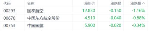 航空股持续低迷,国泰航空、中国东方航空股份、中国国航走低。