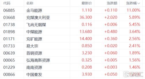煤炭股活跃,兖煤澳大利亚涨近6%,中煤能源、兖矿能源、易大宗、首钢资源等跟涨。