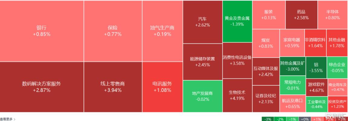 盘面上,作为市场风向标的大型科技股集体反弹,京东涨近10%,网易涨超5%,小米、阿里巴巴、腾讯控股、美团、百度、快手涨超3%;创新药概念走强,三生制药、康诺亚涨超9%;新能源车企股走高,吉利汽车涨近8%;煤炭股活跃,充煤澳大利亚涨近6%;内房股、银行股、保险股、彩票股、影视股、乳制品、石油股等上涨。