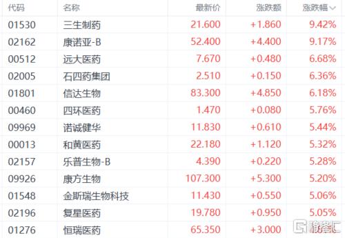 创新药概念走强,三生制药、康诺亚涨超9%,远大医药、石四药集团、信达生物、四环医药等跟涨。