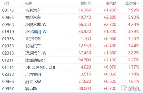新能源车企股走高,吉利汽车涨近8%,零跑汽车、小鹏汽车、小米集团、北京汽车、长城汽车、理想汽车、比亚迪股份等跟涨。