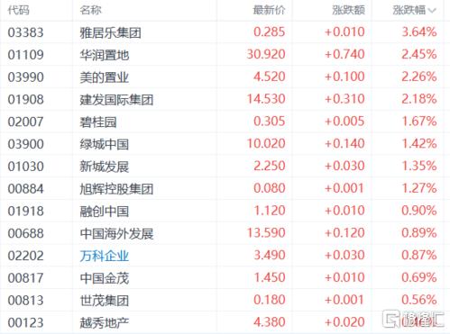 内房股上涨,华润置地、美的置业、建发国际集团、碧桂园、绿城中国、新城发展、融创中国等跟涨。