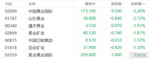 黄金股继续下挫,中国黄金国际跌超5%,山东黄金、潼关黄金、紫金矿业、中国白银集团、招金矿业、紫金黄金国际等跟跌。