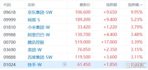 权重科技股集体上涨,京东涨近10%,网易涨超5%,小米、阿里巴巴、腾讯控股、美团、百度、快手涨超3%。