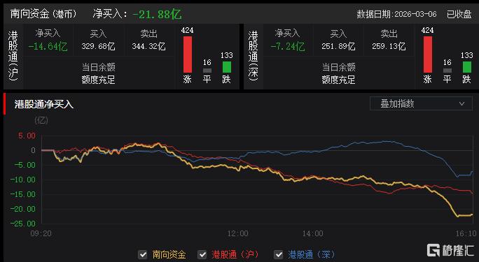 今日,南向资金净卖出21.88亿港元,其中港股通(沪)净卖出14.64亿港元,港股通(深)净卖出7.24亿港元。