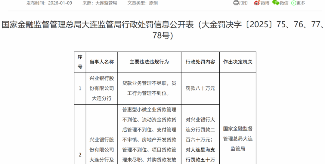 昨天,国家金融监督管理总局大连监管局(下称“大连金融监管局”)披露了一份行政处罚信息公开表,兴业银行(601166.SH)大连分行多名责任人因信贷业务问题被追责。