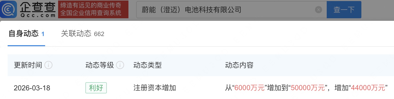 企查查APP显示,近日,蔚能(澄迈)电池科技有限公司发生工商变更,注册资本由6000万元增至5亿元,增幅约733%。企查查信息显示,该公司成立于2025年,经营范围包括电动汽车充电基础设施运营、蓄电池租赁、新能源汽车废旧动力蓄电池回收及梯次利用等,由武汉蔚能电池资产有限公司全资持股。