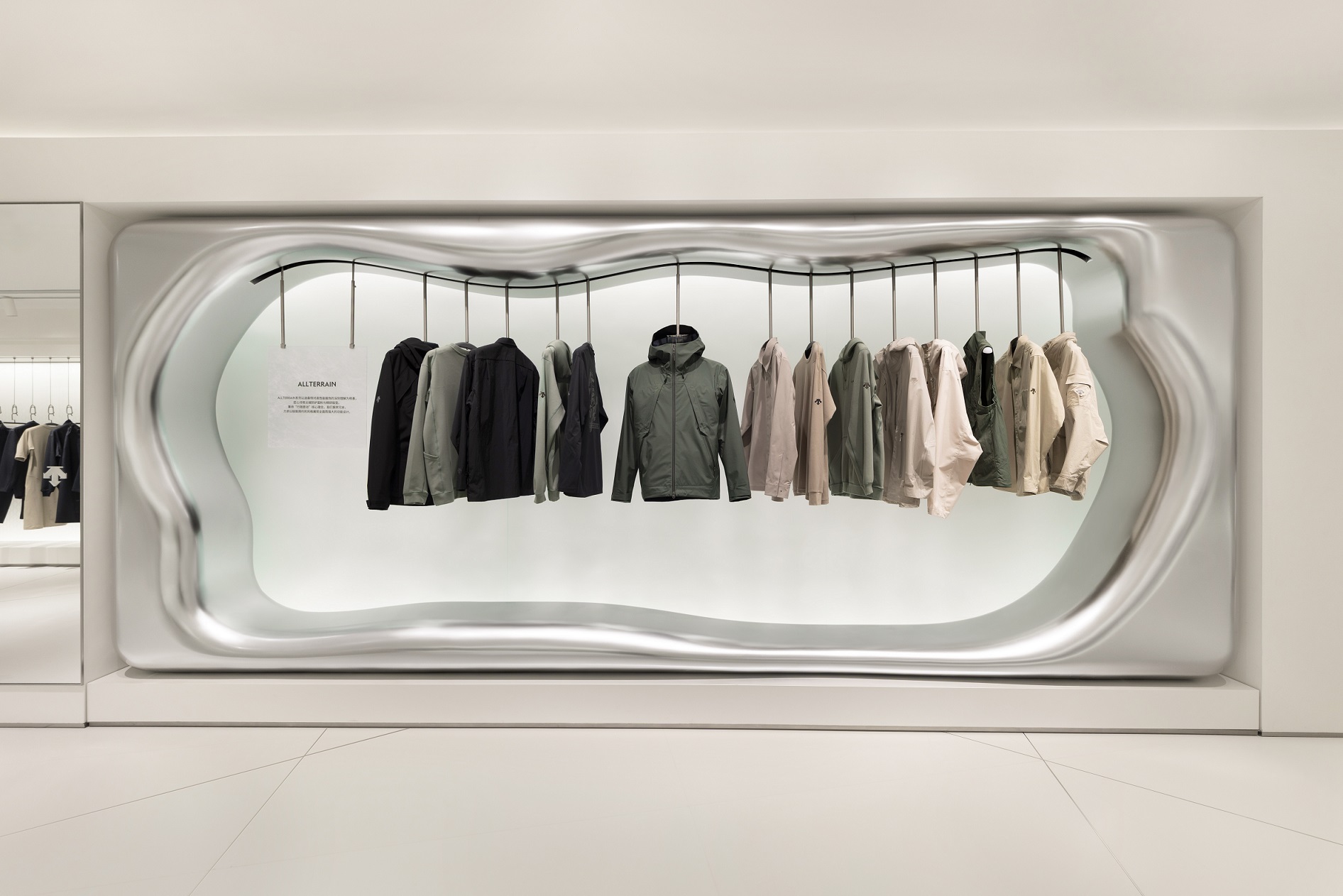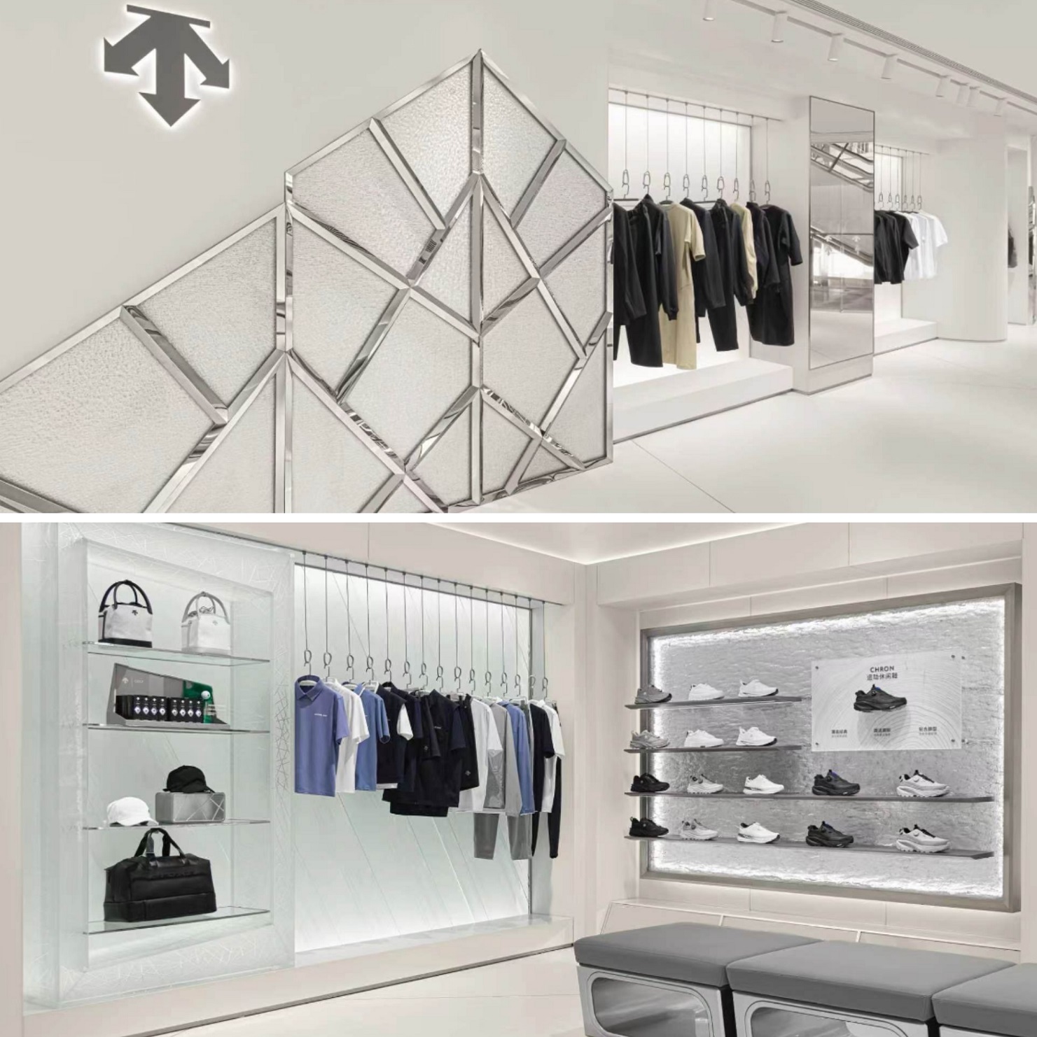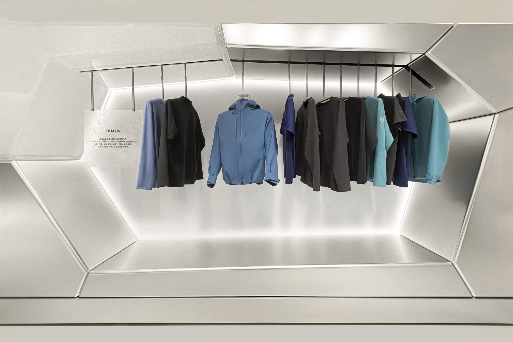 该店铺在整体设计上以冰川生成与消融的自然过程为灵感,围绕冰雪不同形态的演化逻辑,以多个空间节点串联出层层递进的探索路径。通过将自然演化的逻辑转译为空间体验,迪桑特在产品展示之外构建起连接运动、自然与生活方式的品牌场域,并在空间叙事中建立产品性能与自然意象之间的直观关联,使专业科技呈现与生活方式体验在同一场域中自然交汇。