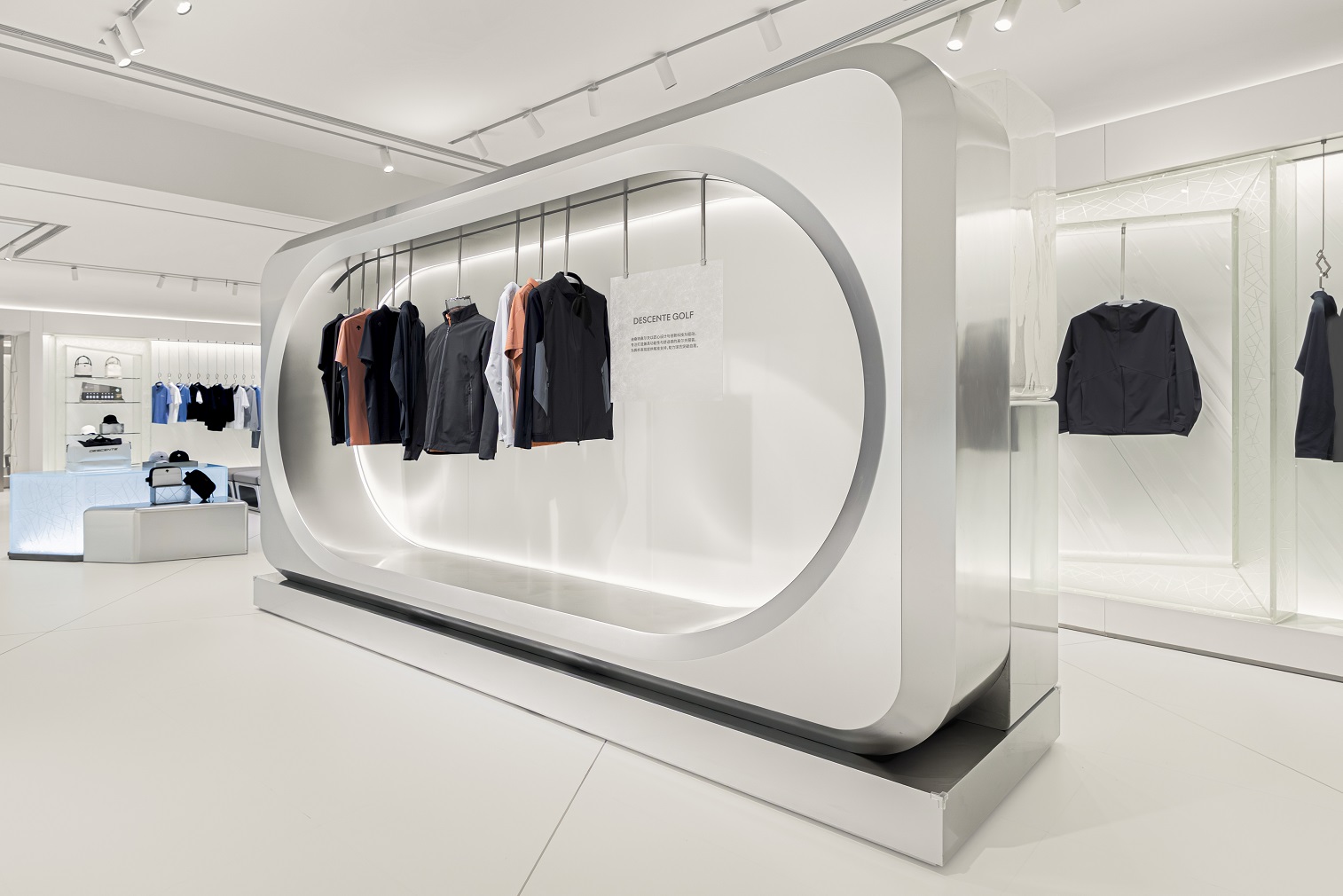 店内空间围绕不同产品系列打造多元陈列场景。“水释冰陆”区域呈现ALLTERRAIN系列,该区域以雨水在低温环境中凝结并延展的自然形态为灵感,传递ALLTERRAIN系列产品适应多变环境及地形的特质。“裂冰之地”区域聚焦DUALIS系列,通过挺拔的线性结构呼应城市天际线,契合其作为都市机能系列在都市通勤与日常运动中的多样适配性。高尔夫系列陈列于“琉璃弧线”空间,以流线型结构模拟球体轨迹,展现高球运动的优雅与精准。鞋墙则以冰晶结构为灵感,通过有序排列强化整体视觉节奏,统一呈现品牌在设计与功能之间的表达。