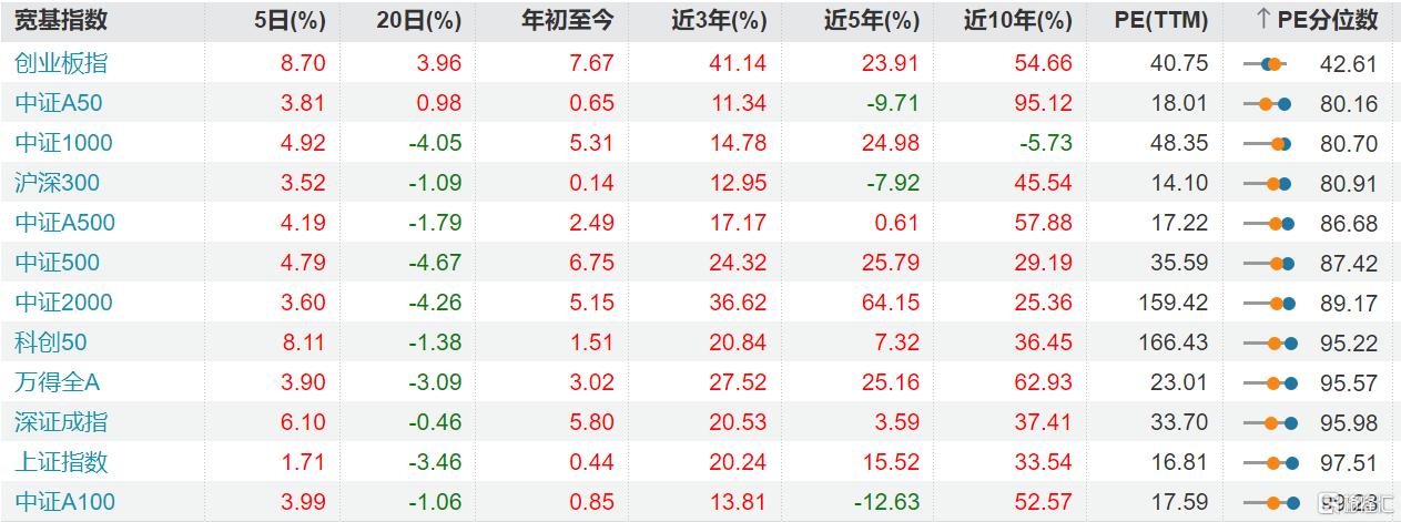 今日早盘创业板指一度涨1%,创逾10年新高,不过最终收跌1%,但创业板50、创业板指分别涨11.54%、10.36%,位居A股宽基指数前列。
