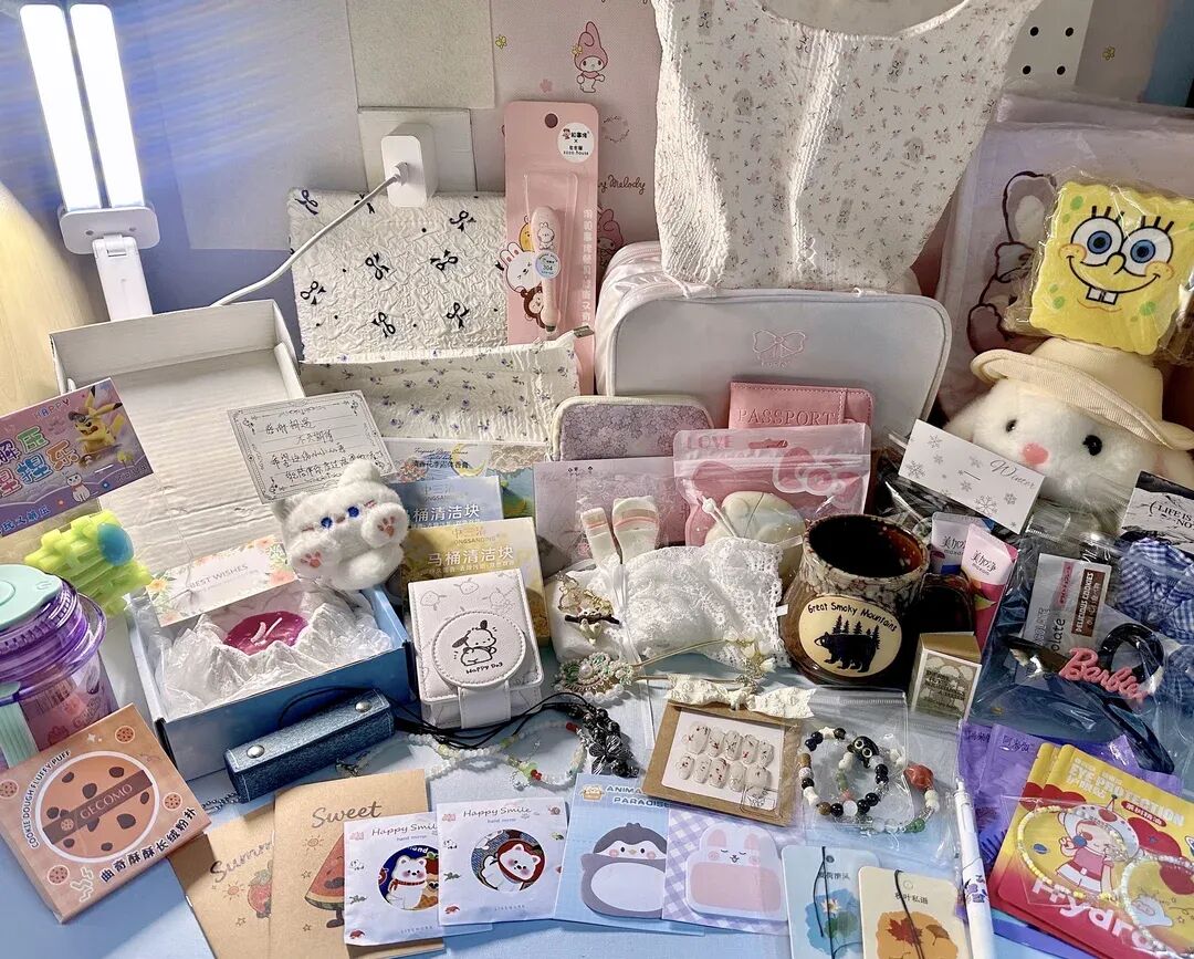 洛西则是Hello Kitty的爱好者。过年那会儿,她在一家盲勺店里下单,虽然每勺要168元,她还是买了两勺,收到了Hello Kitty的杯子、收纳包、毛绒挂件等,送的3个扭蛋中,有一个还扭到了一件印有粉色小熊的毛衣。