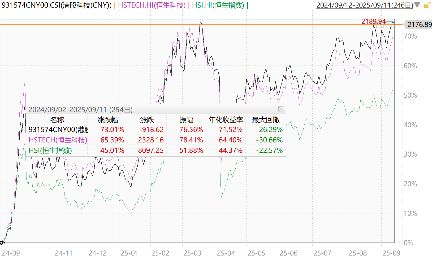 广发证券复盘指出,在美联储降息后的12个月,港股多数上涨。Wind数据显示,去年9月降息至9月11日,恒指已经涨超45%,恒生科技涨超65%,港股科技(CNY)更是暴涨73%!