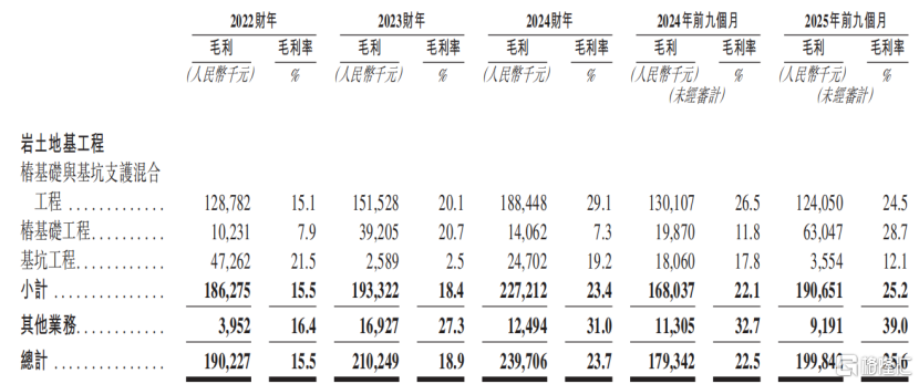 岩土工程及其他服务的毛利及毛利率,来源:招股书