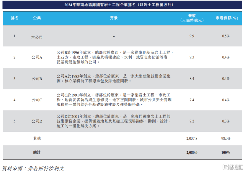 按2024年岩土工程相关营收计,参与华南地区岩土工程项目的非国有企业前五大市场参与者共占2%的市场份额,宏业基为华南地区最大的非国有岩土工程企业。