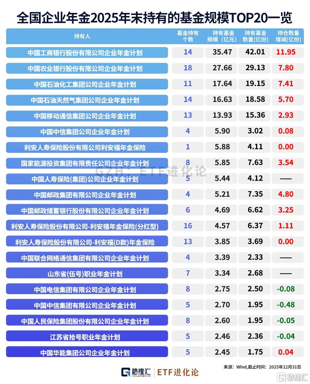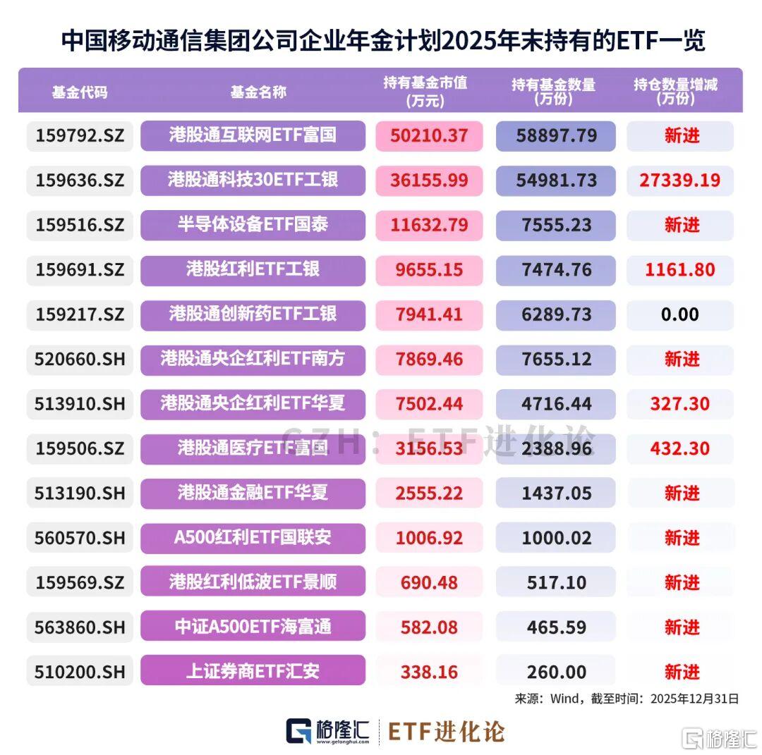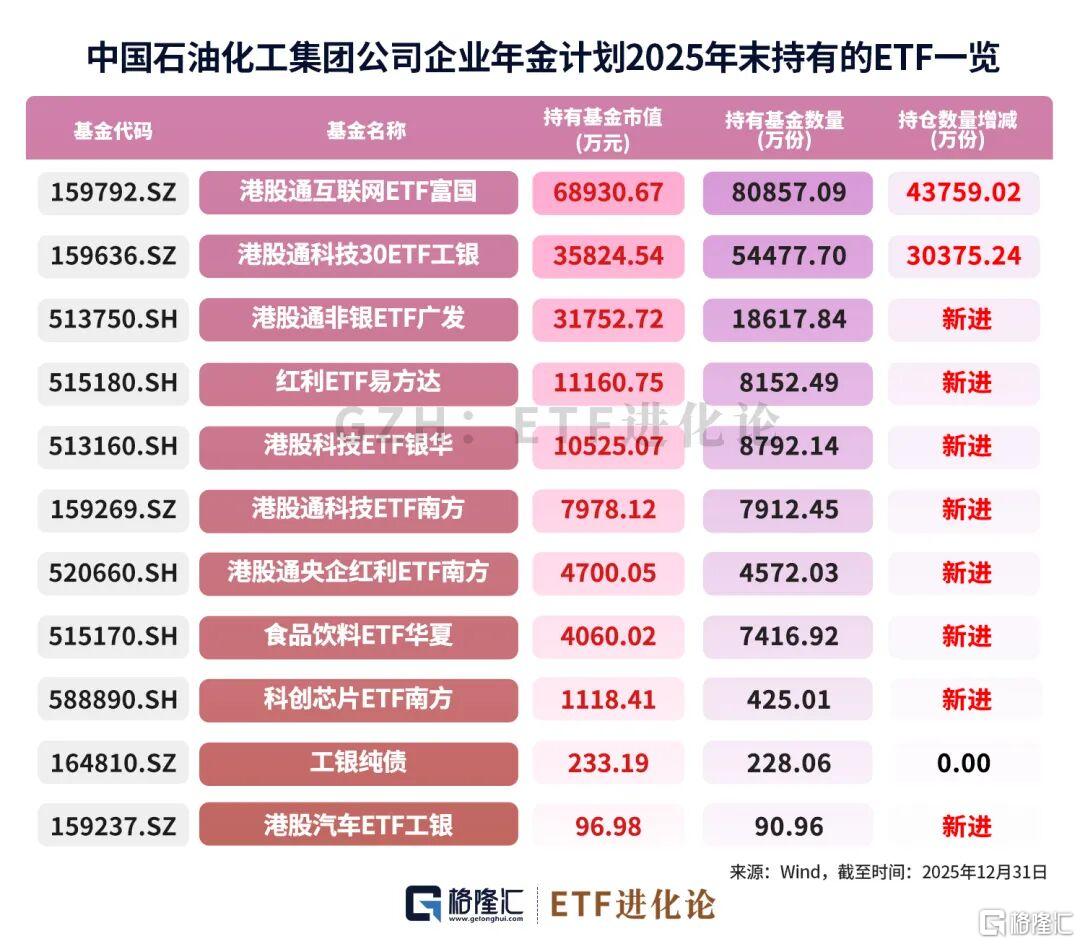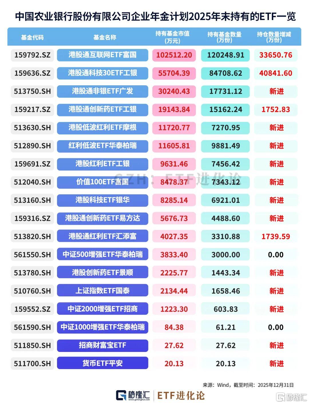 截至2025年年底,企业年金规模超10亿有:工商银行、农业银行、中石化、中石油和中国移动,ETF持仓集中在港股通互联网ETF、港股创新药ETF、红利策略ETF等。