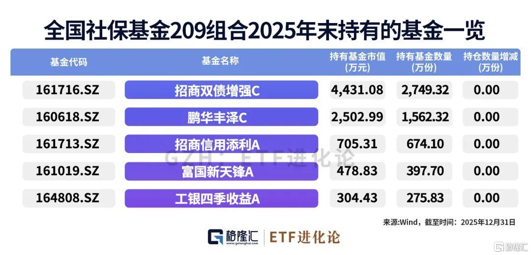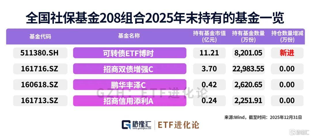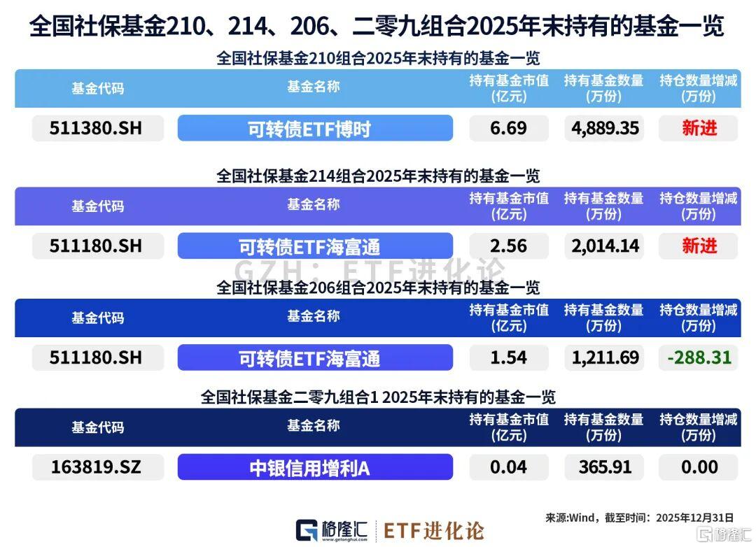 截至2025年底,社保基金持有基金市值超1亿元的组合有4个,持仓集中在可转债ETF、招商双债增强C等固收类基金。