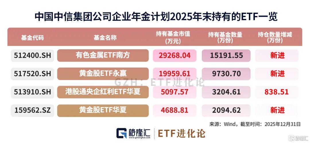中信集团年金计划新进:有色金属ETF南方、黄金股ETF永赢和黄金股ETF华夏,加仓:港股通央企红利ETF华夏。