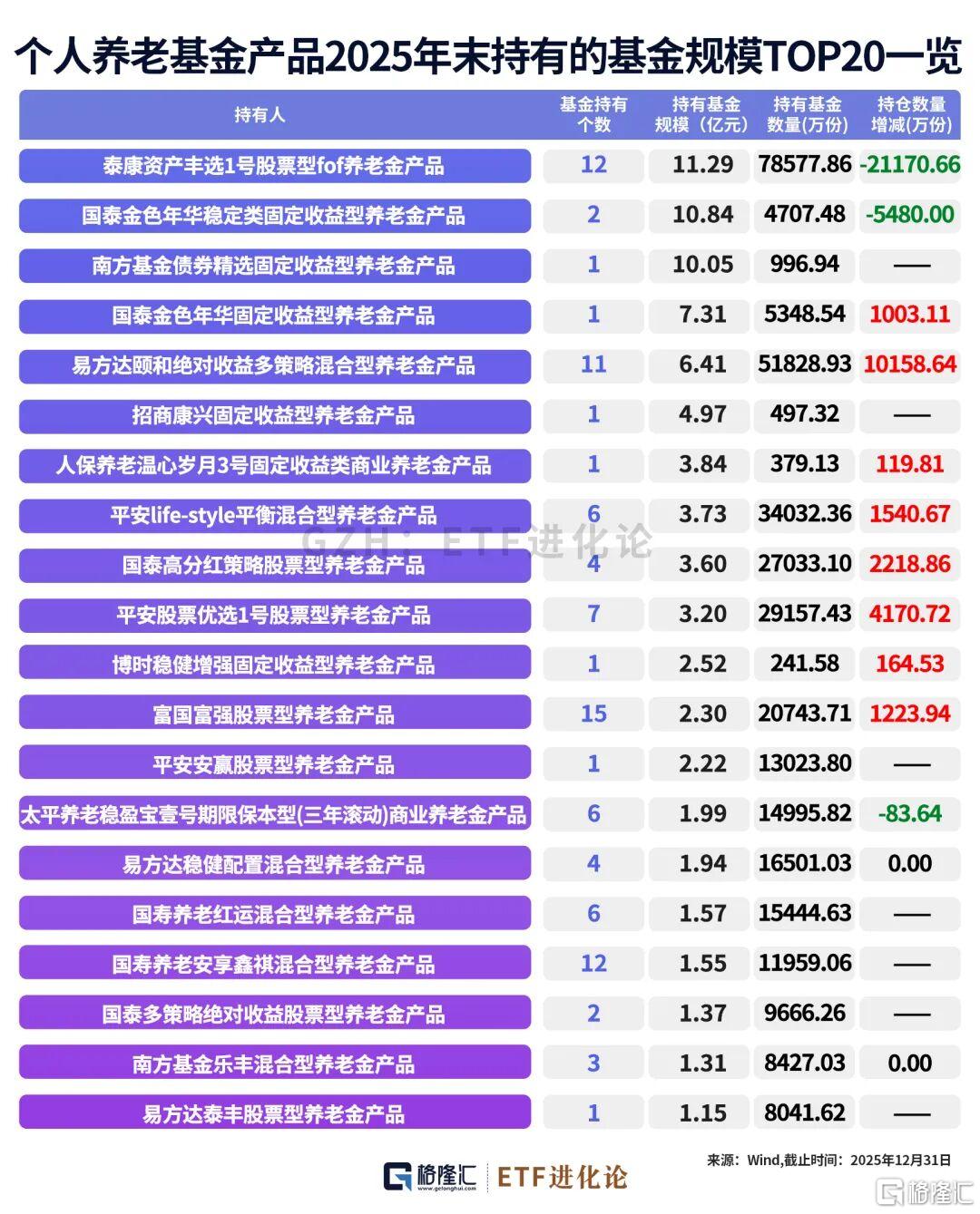 截至2025年末,持有基金规模居前的个人养老金产品有:泰康资产丰选1号股票型fof养老金产品、国泰金色年华稳定类固定收益型养老金产品、易方达颐和绝对收益多策略混合型养老金产品等,ETF持仓类型多样,包括半导体主题ETF、新能源主题ETF、红利策略ETF、港股ETF等。