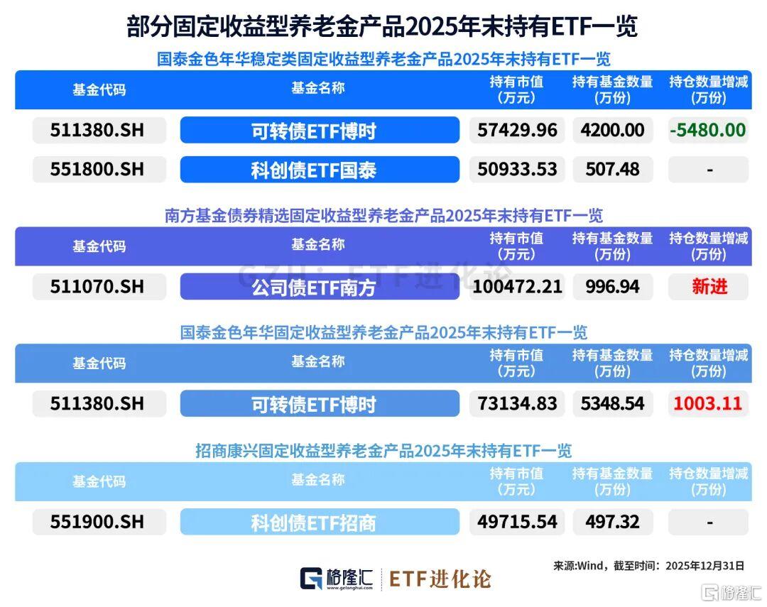 固定收益型养老金产品主要持有:可转债ETF博时、科创债ETF国泰、公司债ETF南方和科创债ETF招商。