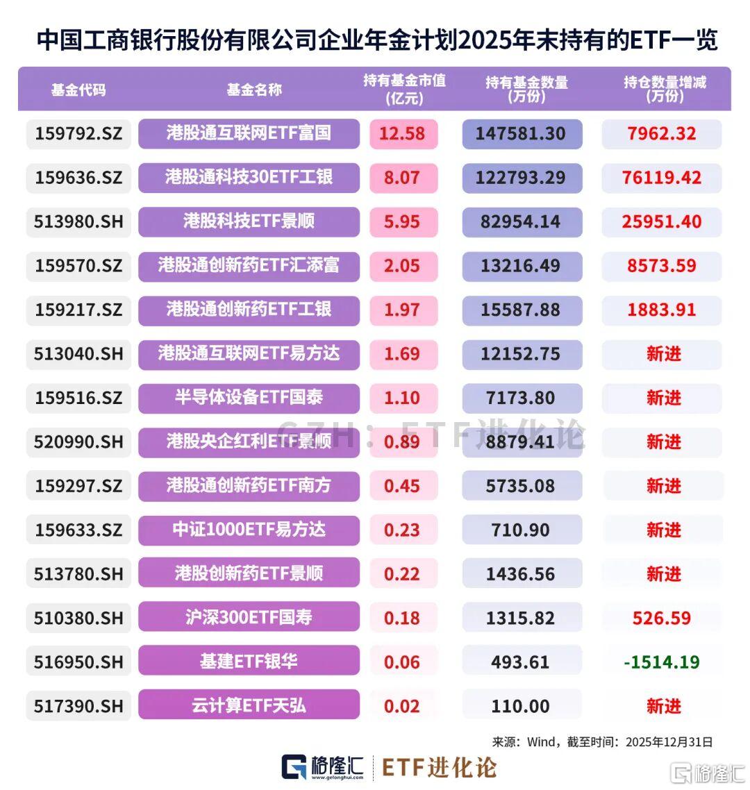 其中,工商银行年金计划持有:港股通互联网ETF富国、港股通科技30ETF工银、港股科技ETF景顺、港股通创新药ETF汇添富。
