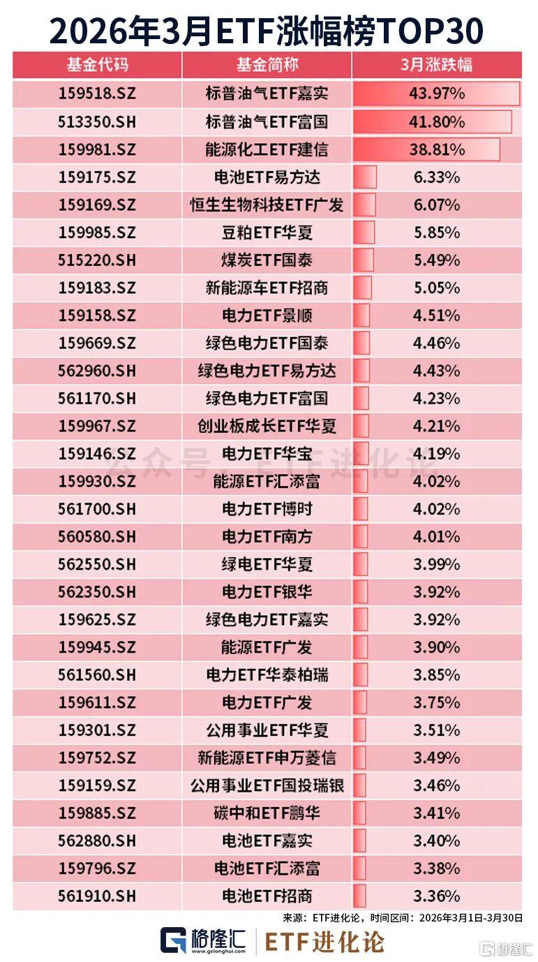 3月美伊冲突,ETF市场跑出一份极端榜单:两只标普油气ETF暴涨40%、能源化工ETF建信涨38%,其余ETF涨幅均为个位数。