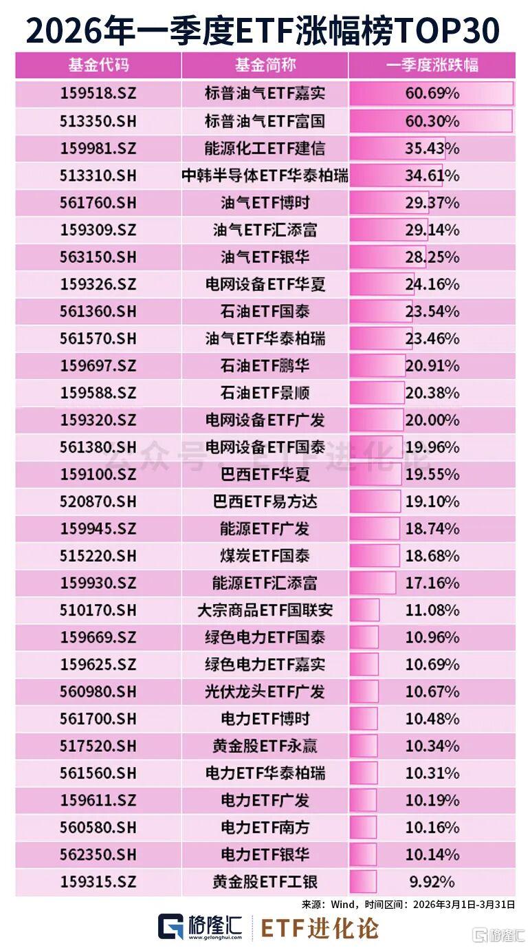 这不仅改变ETF的月度排名,更让一季度榜单大洗牌——标普油气ETF直接反超中韩半导体ETF华泰柏瑞,登顶季度涨幅冠军,涨幅高达60%。