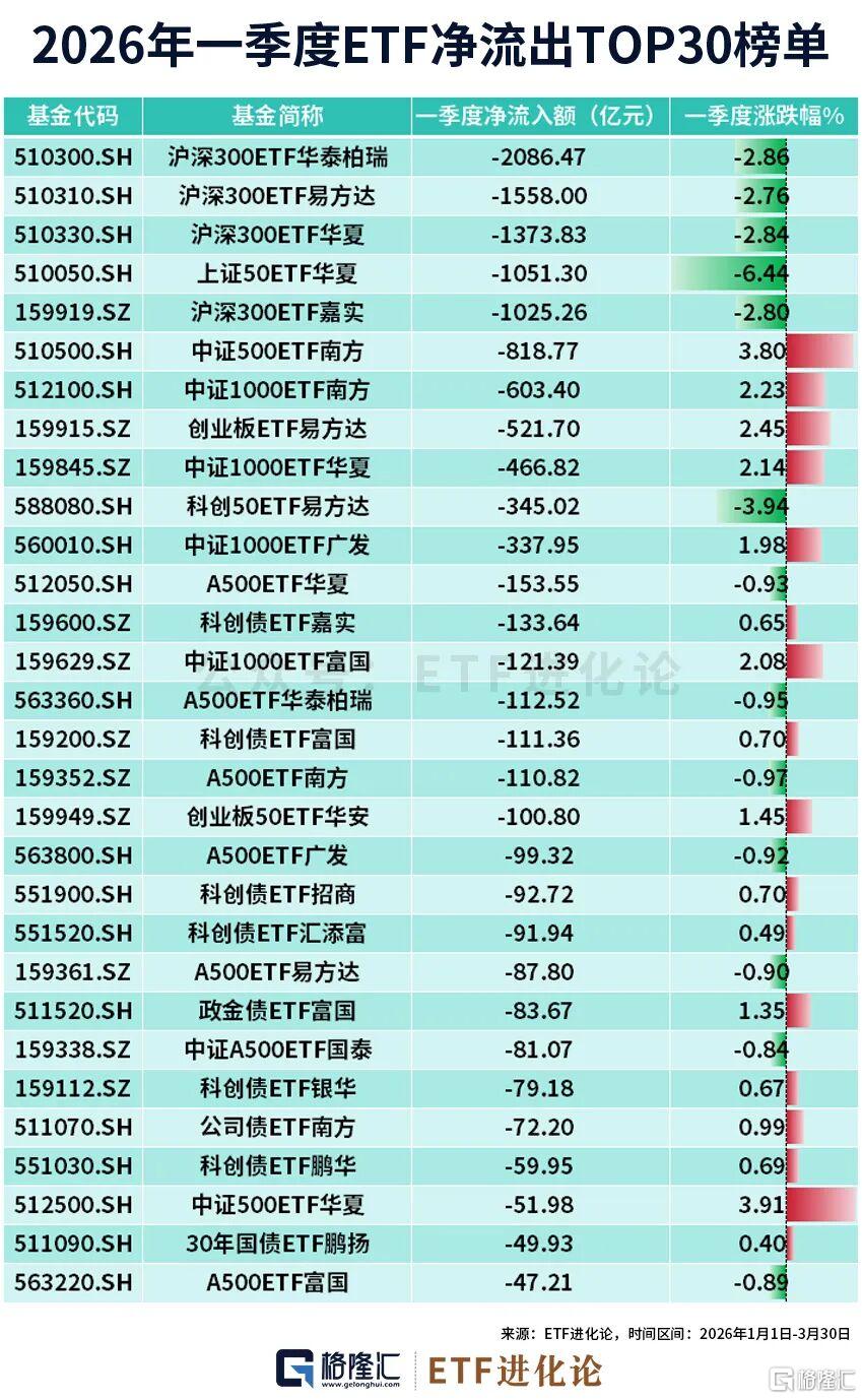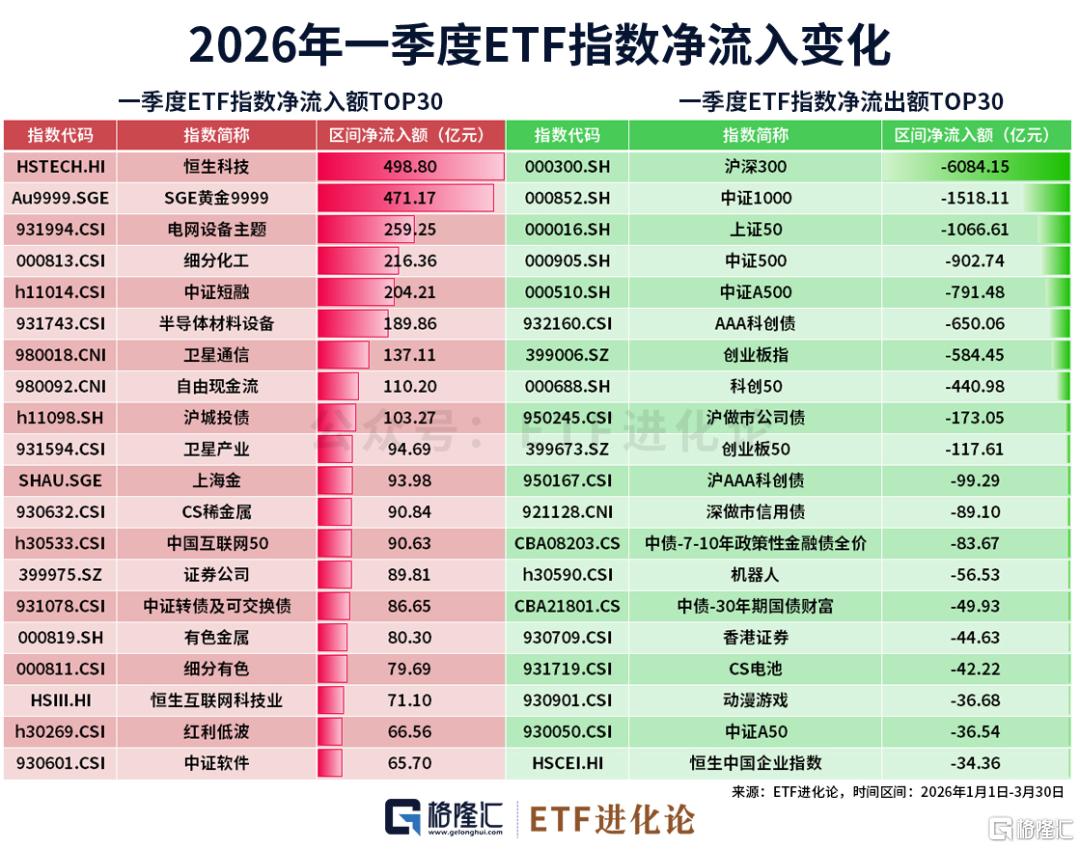一季度资金大幅流出核心宽基、固收成长与高波动赛道:沪深300、上证50、中证500、中证1000等核心宽基净流出均超900亿。