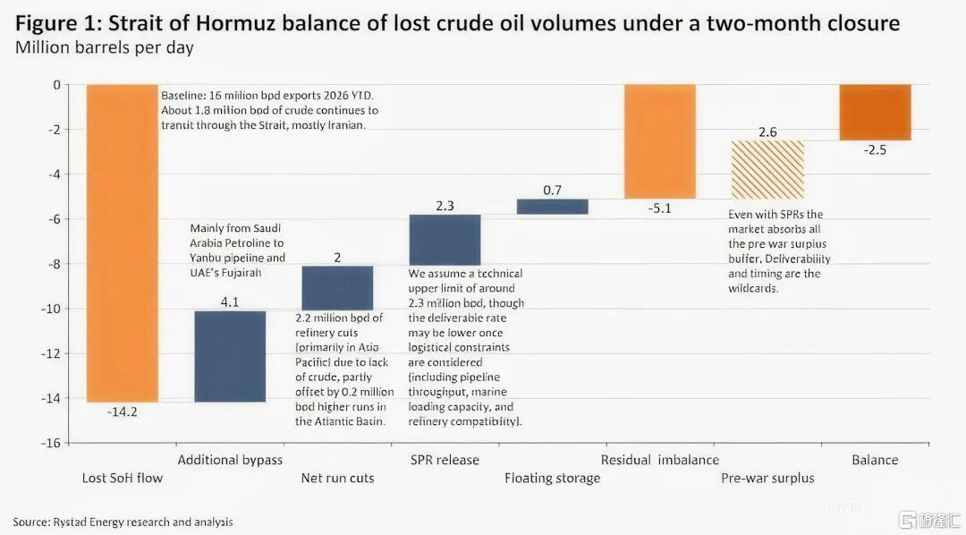 能源研究机构Rystad Energy的模拟结论更令人不安:霍尔木兹海峡关闭两个月,即使考虑需求萎缩、启用备用管道和释放SPR储备等因素,全球原油供给依然会留下每天720万桶的缺口。