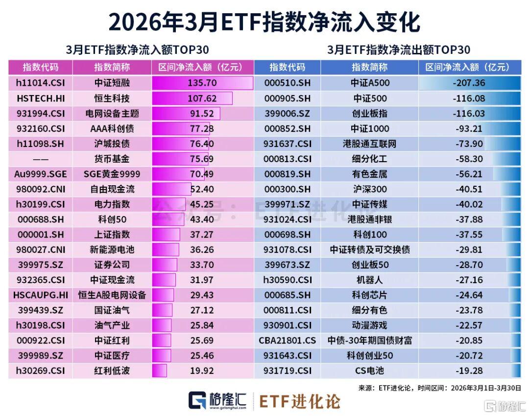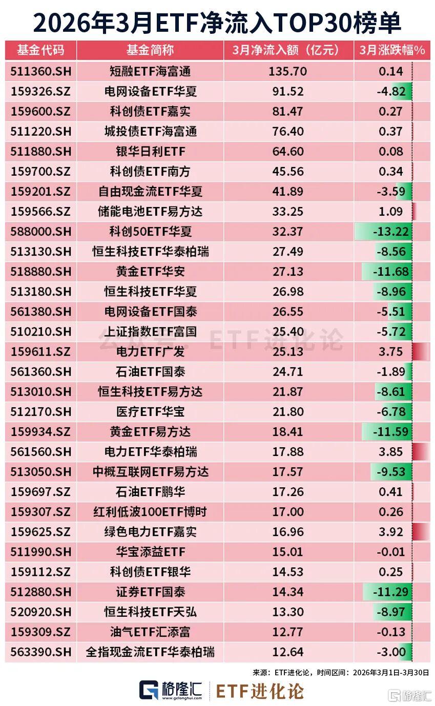 净流入TOP5全是固收类:短融ETF海富通单月流入超百亿,科创债ETF嘉实、城投债ETF海富通、银华日利ETF等合计净流入超360亿。