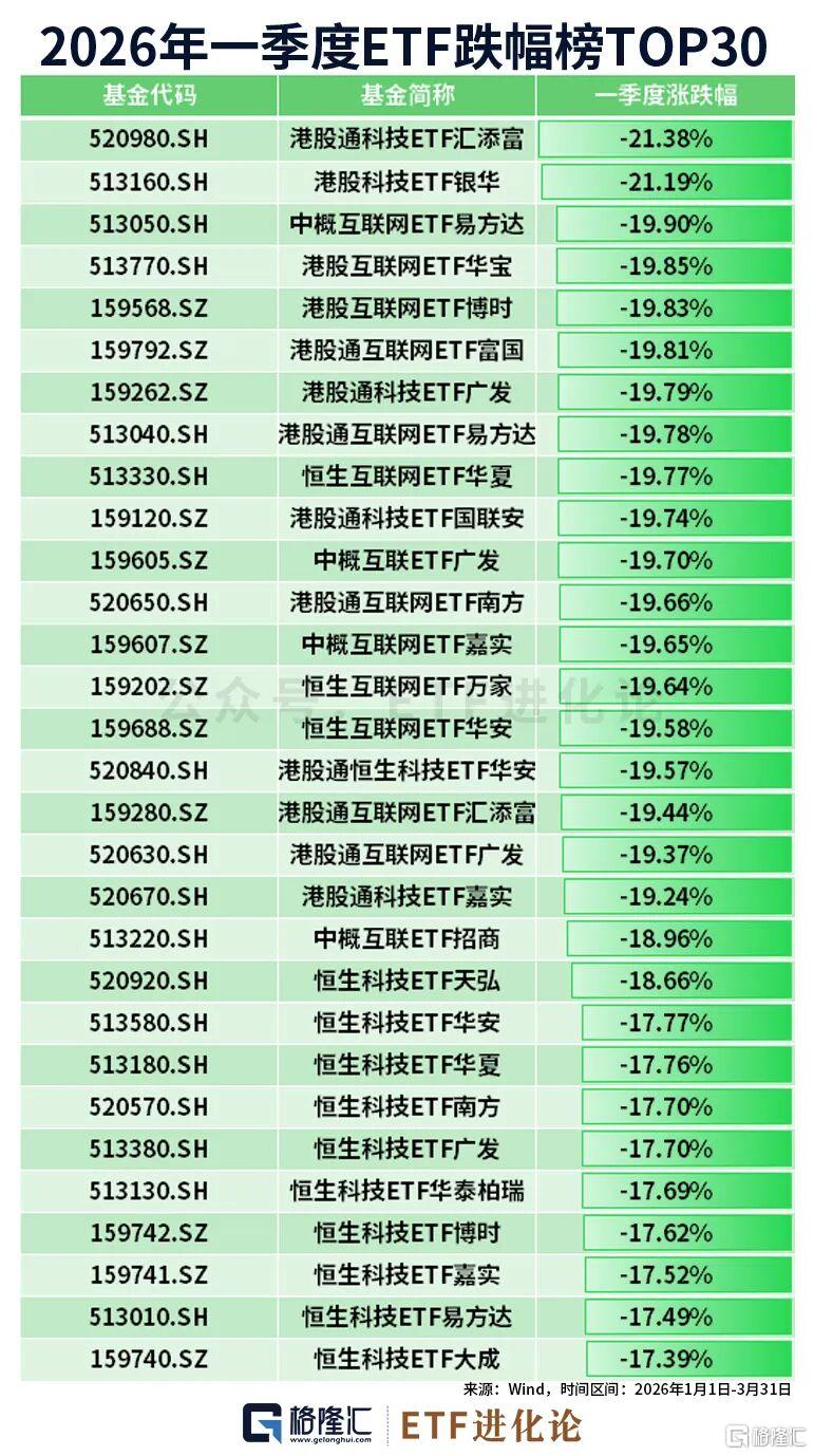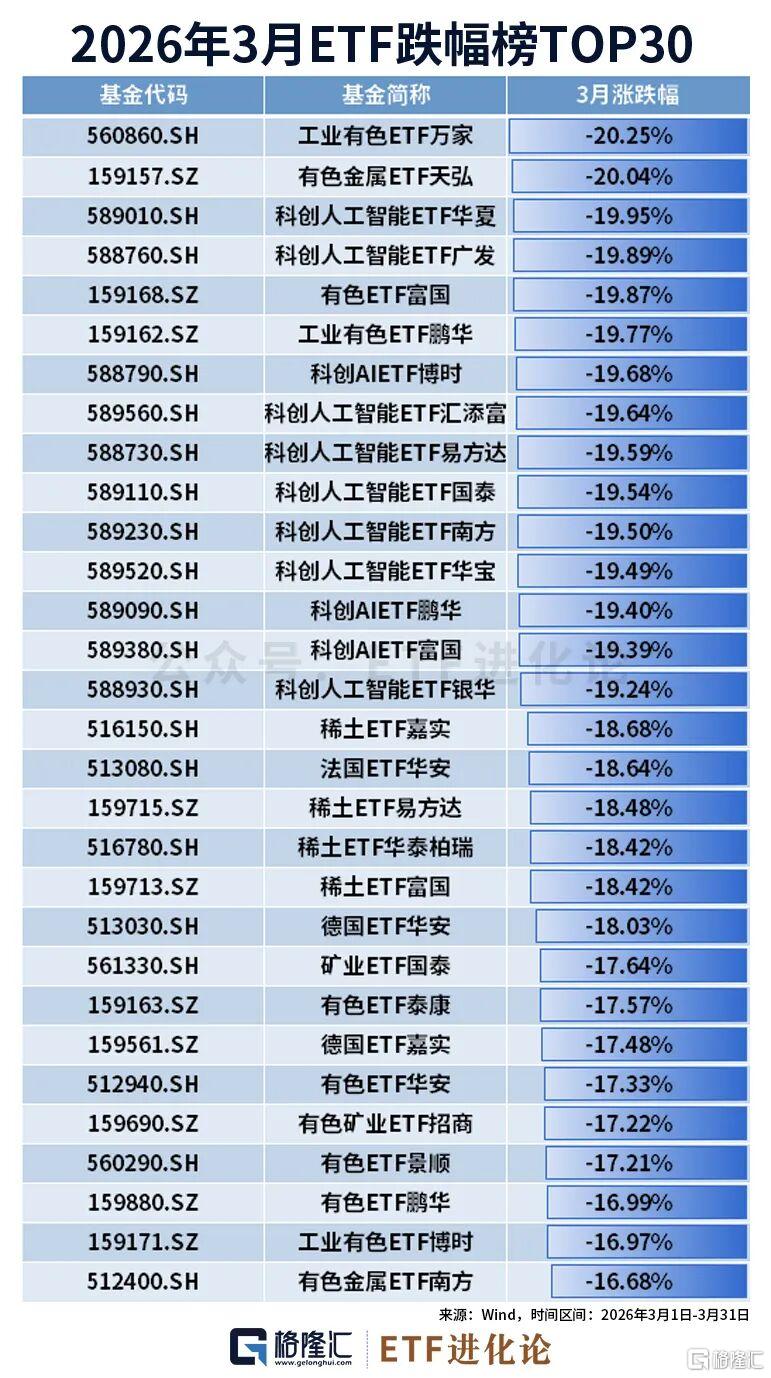 工业有色ETF万家、有色金属ETF天弘3月跌20%,科创人工智能ETF华夏、科创人工智能ETF广发跌19%。