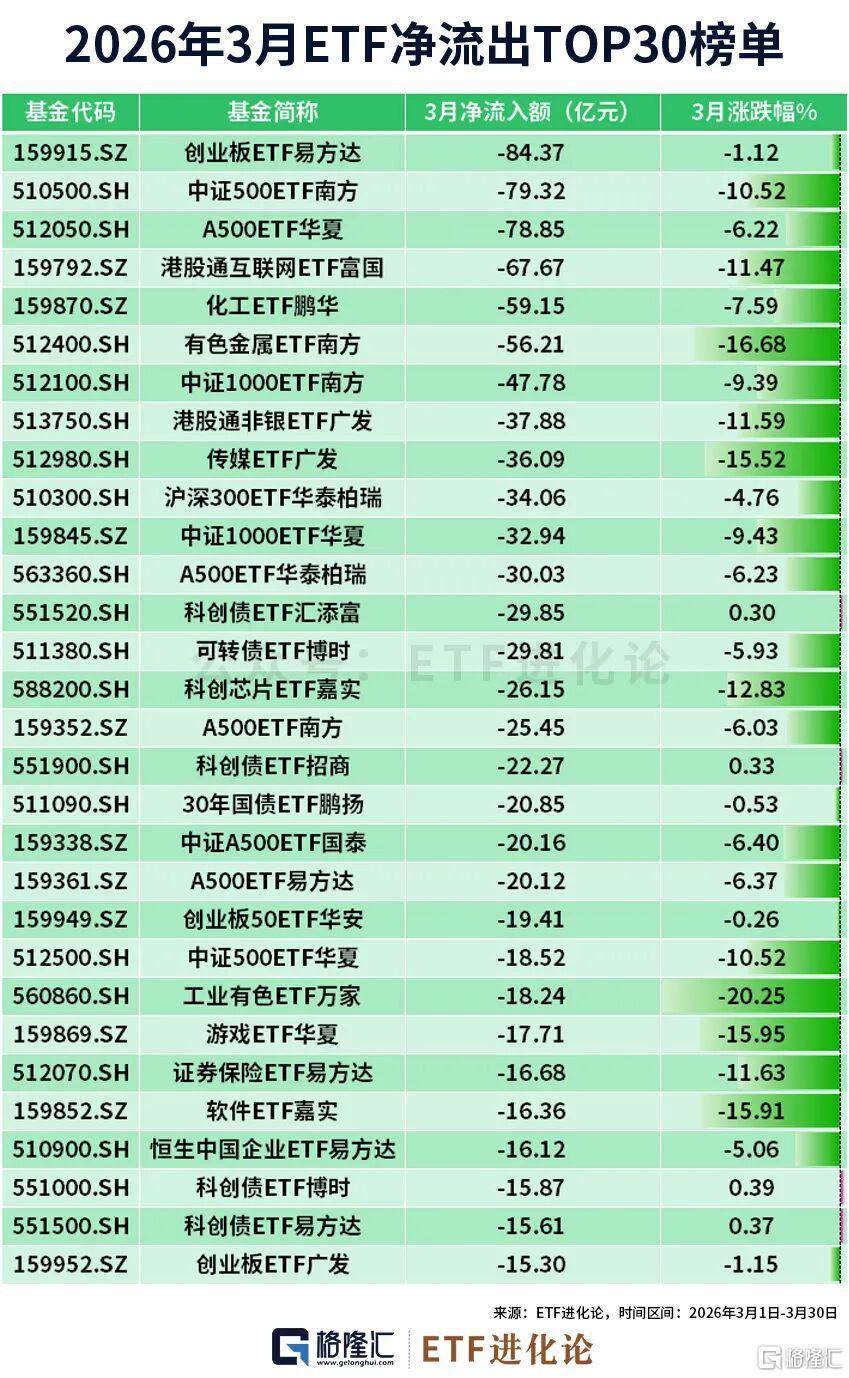 资金大幅撤离高弹性品种:细分化工、科创芯片等周期成长赛道被集中减持,创业板ETF易方达、化工ETF鹏华、有色金属ETF南方净流出居前。