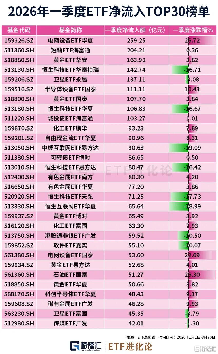 能源赛道持续获资金重仓:电网设备ETF华夏一季度净流入259.25亿,居ETF市场第一,细分化工、油气相关资产同步获配置,如化工ETF鹏华期内净流入超90亿。