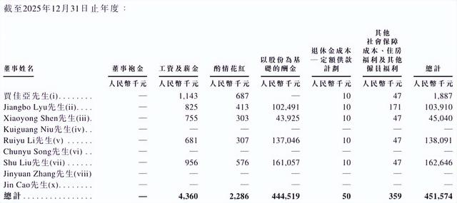 招股书披露,2025年公司以股份为基础的支付开支激增至4.75亿元。最为引人注目的是,吕江波(Jiangbo Lyu)、李睿宇(Ruiyu Li)、刘枢(Shu Liu)三位高管的薪酬分别为1.04亿元、1.38亿元、1.63亿元,三人合计酬金总额超过4亿元。尽管其中绝大部分为非现金形式的股份酬金,但在公司三年亏损超过22亿元的背景下,过亿年薪依然形成了强烈的视觉反差。
