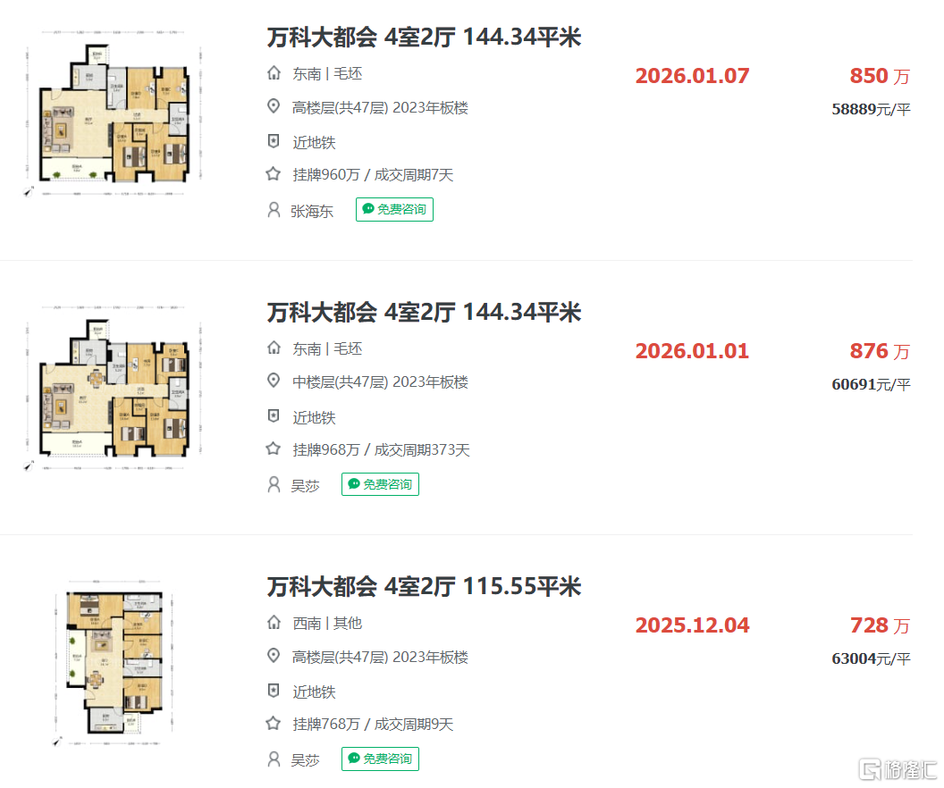项目近距离的万科大都会今年1月成交了一套144.34平户型,成交总价约850万,折合单价约5.89万/平。而1月成交的144.34平户型,成交总价约876万,折合单价约6.07万/平,也快要低于6万/平的价格了。