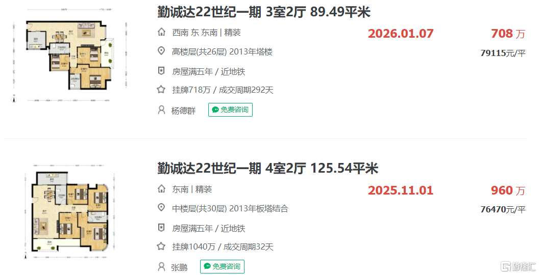 距离珺悦名都步行约1.2公里的勤诚达22世纪一期,今年成交一套约89.49平户型,成交总价约708万,折合单价约7.91万/平。