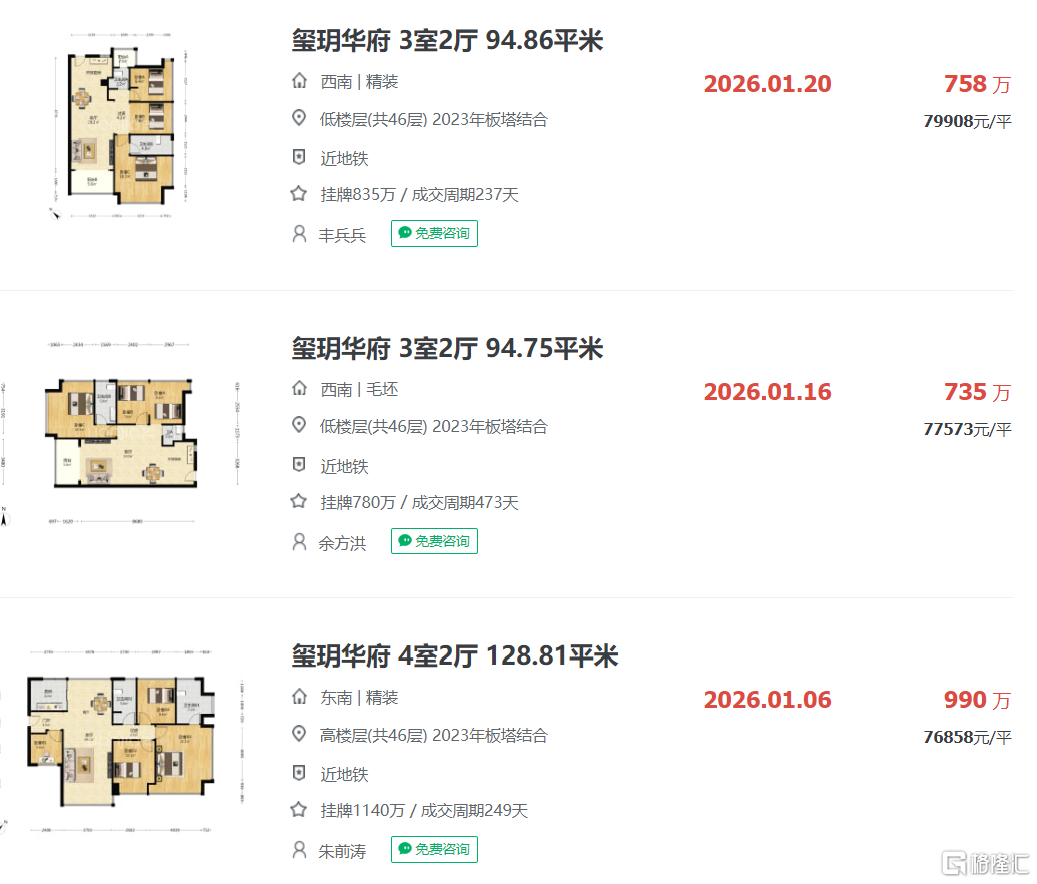 2021年入市的玺玥华府,距离珺悦名都步行约1.3公里,今年1月成交三套房源,一套成交单价约7.69万/平,一套成交单价约7.76万/平,还有一套成交单价约7.99万/平。