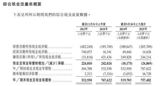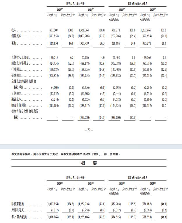 若以2023年与截至2025年9月30日止九个月对比,毛利率由16.0%升至28.9%,销售及市场开支率由52.7%降至30.5%,研发开支率由38.3%降至20.4%,行政开支率由23.7%降至12.3%;但截至2025年9月30日止九个月,期内亏损率仍为46.6%。这或意味着,规模扩大与费用率下行的力度,尚不足以扭转损益表。