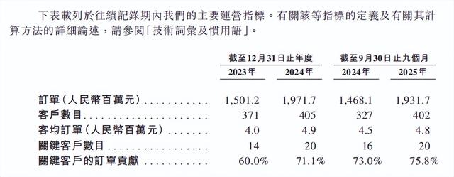客户集中度方面,2023年、2024年及截至2025年9月30日止九个月,来自前五大客户的收入分别占当期总收入的32.1%、36.7%及48.2%。其最大单一客户的收入分别占当期总收入的15.6%、12.7%及30.4%。结合关键客户订单贡献升至75.8%,可以看到订单资源正向头部客户集中,大客户、大项目在业务中的权重正在上升。