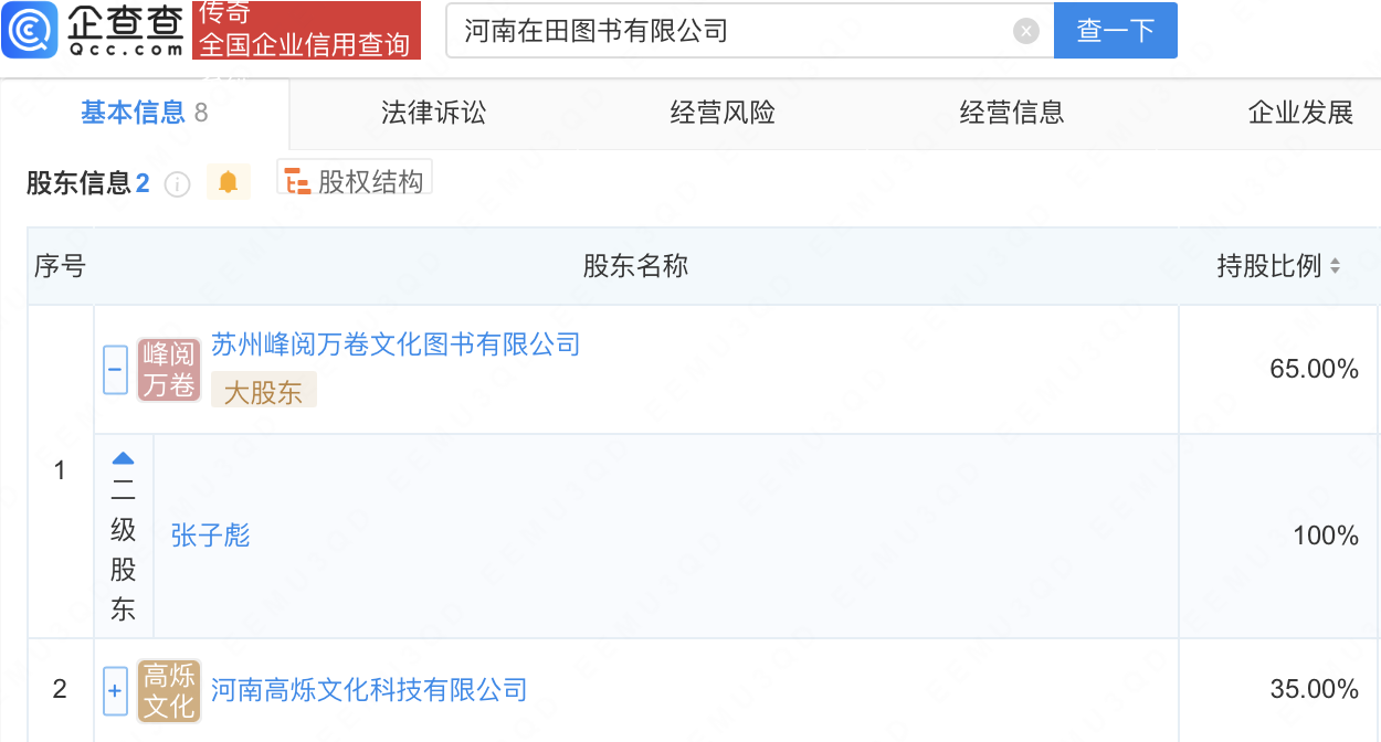 企查查APP显示,近日,河南在田图书有限公司成立,法定代表人为武亮,注册资本500万人民币,经营范围包括出版物零售、出版物批发、出版物印刷等,由张雪峰(张子彪)全资持股的苏州峰阅万卷文化图书有限公司、河南高烁文化科技有限公司共同持股。