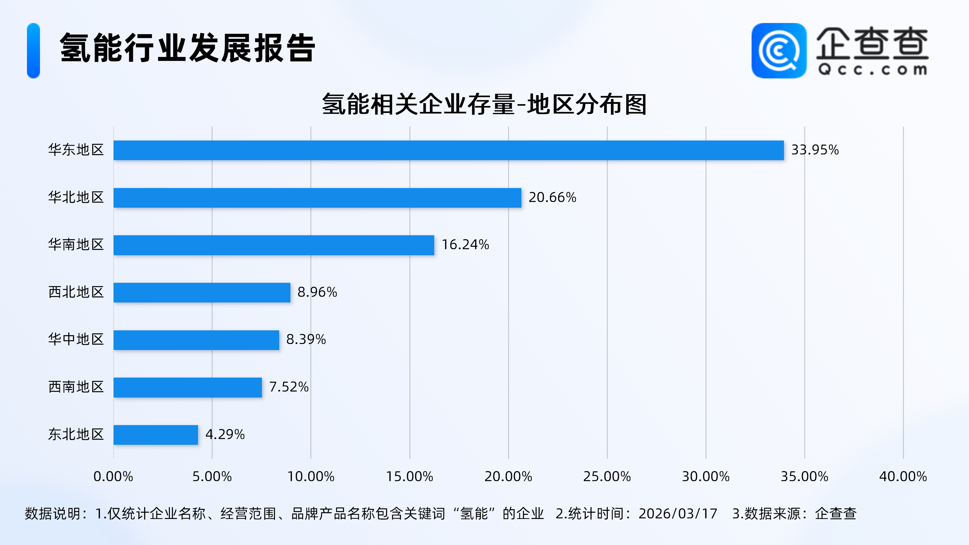 企查查数据显示,氢能相关企业区域分布呈现明显的区域集聚特征,华东地区企业存量占比最高,达33.95%。其次,华北地区占比20.66%,华南地区占比16.24%,三大东部沿海区域合计占比70.85%,集中了全国超七成的氢能企业,形成了相关企业发展的核心增长极。