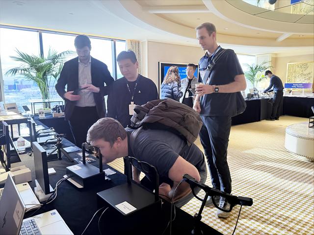 光学领域的布局进一步完善了瑞声科技的全栈能力。基于此前对业界领先的光波导技术公司Dispelix的战略收购,瑞声科技此次展出的高性能衍射光波导解决方案,实现了轻量化设计与广视场、高清晰度的完美平衡,为AR眼镜带来体验升级。配套的电致变色技术可根据环境光线智能调节镜片透光率,有效提升AR设备的户外可视性与佩戴舒适度。展台现场,沉浸式的观影眼镜Demo、直观演绎了从光学显示、智能声场到自适应交互的端到端解决方案,标志着瑞声科技已形成“感知+光学”的深度融合生态。