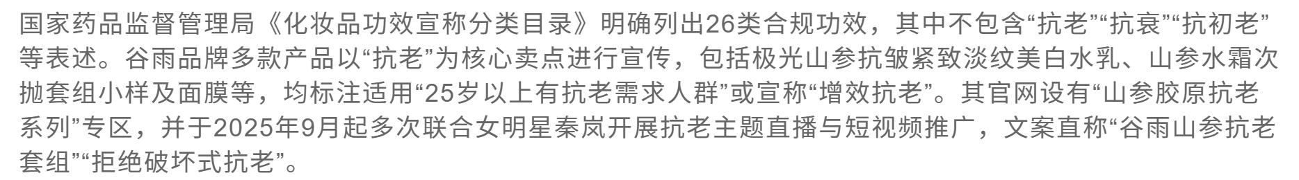 据多家媒体报道,谷雨品牌多款产品以“抗老”为核心卖点进行宣传,包括极光山参抗皱紧致淡纹美白水乳、山参水霜次抛套组小样及面膜等,均标注适用“25岁以上有抗老需求人群”或宣称“增效抗老”。其官网设有“山参胶原抗老系列”专区,并于2025年9月起多次联合女明星秦岚开展抗老主题直播与短视频推广,文案直称“谷雨山参抗老套组”“拒绝破坏式抗老”。
