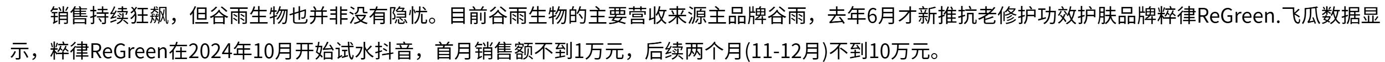据《新快报讯》报道,目前谷雨的主要营收来源为主品牌谷雨,2024年6月才新推抗老修护功效护肤品牌粹律ReGreen。然而,新品牌的试水效果并不理想。飞瓜数据显示,粹律ReGreen在2024年10月开始试水抖音,首月销售额不到1万元,后续两个月(11-12月)不到10万元。