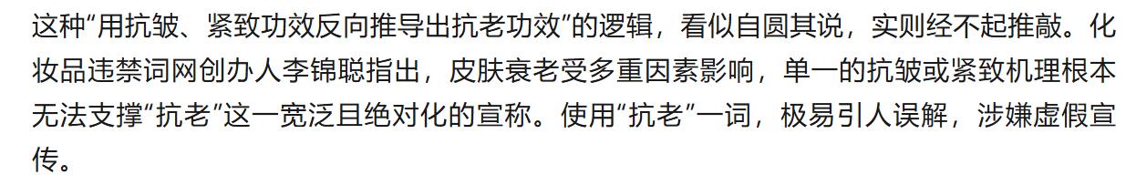 这种“用抗皱、紧致功效反向推导出抗老功效”的逻辑,看似自圆其说,实则经不起推敲。据《颜值风云》报道,化妆品违禁词网创办人李锦聪指出,皮肤衰老受多重因素影响,单一的抗皱或紧致机理根本无法支撑“抗老”这一宽泛且绝对化的宣称。使用“抗老”一词,极易引人误解,涉嫌虚假宣传。