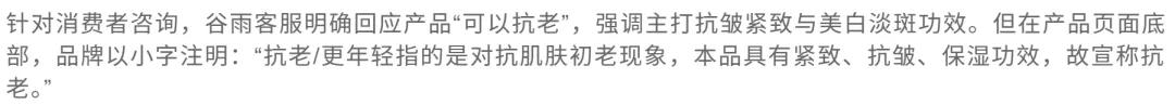 面对消费者咨询,谷雨客服明确回应产品“可以抗老”,强调主打抗皱紧致与美白淡斑功效。但在产品页面底部,品牌以小字注明:“抗老/更年轻指的是对抗肌肤初老现象,本品具有紧致、抗皱、保湿功效,故宣称抗老。”