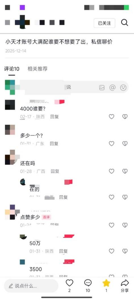 ▲有小天才点赞50万的账号开价3500元