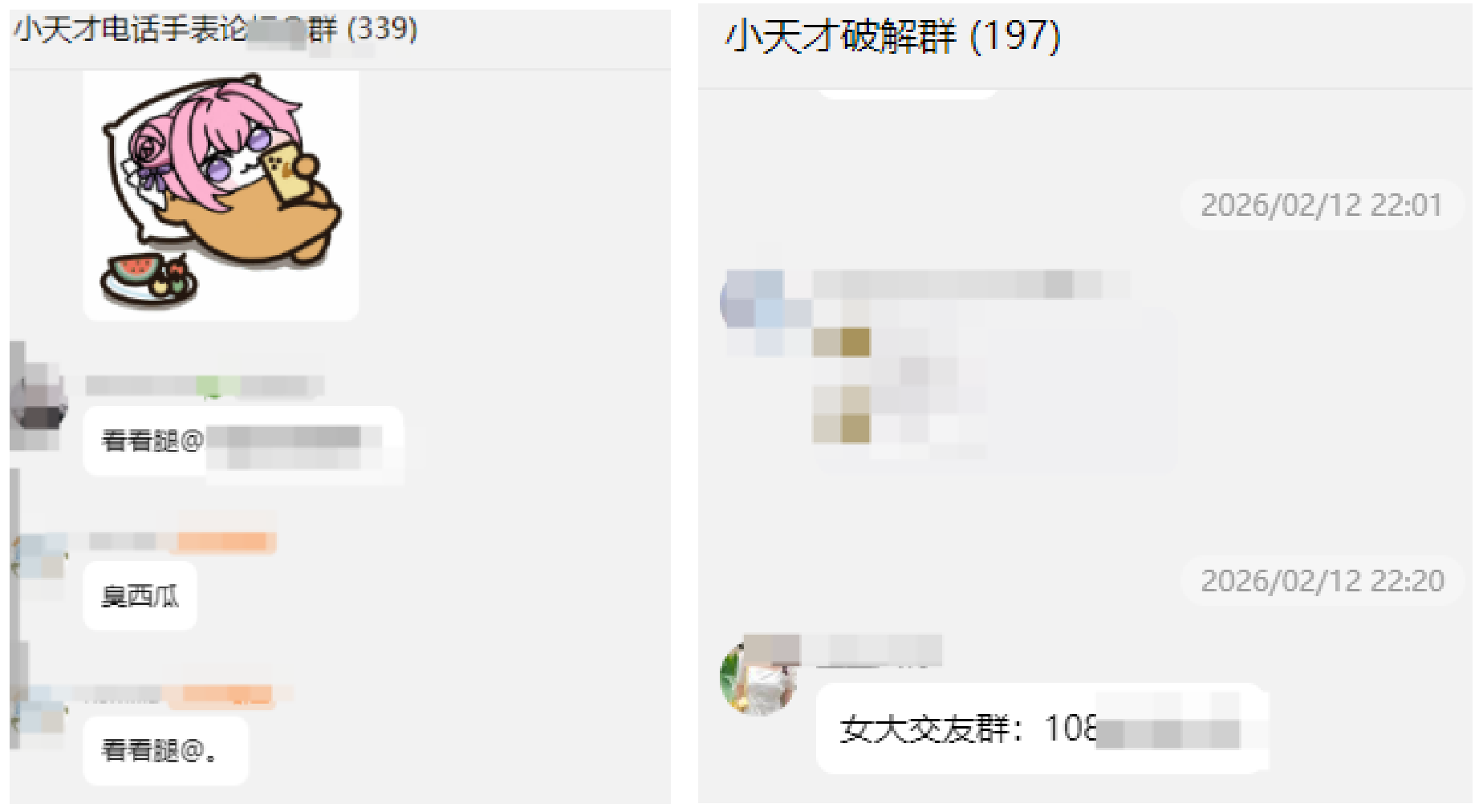 另外,儿童不宜的色情信息更是这些交流群的重灾区,在“论坛群”“破解群”,出现“看看腿”“女大交友”等言论或信息,甚至有人分享成人内容,不堪入目。