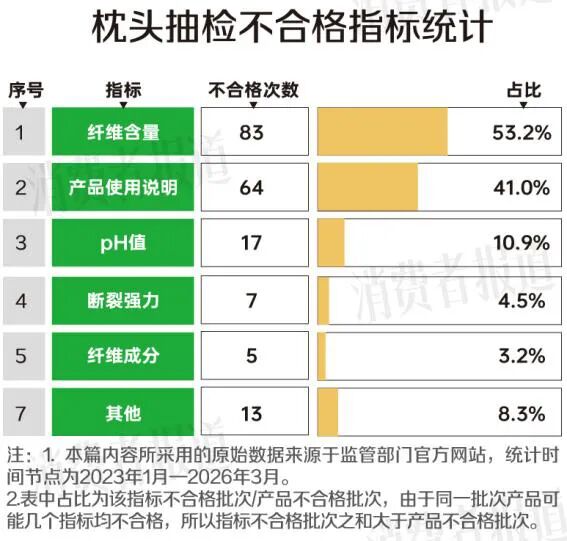 《消费者报道》对156批次不合格的枕头抽检数据进行了分析整理。结果显示,不合格项目主要集中在纤维含量、产品使用说明、pH值这三个指标,不合格批次分别为83批次、64批次和17批次。